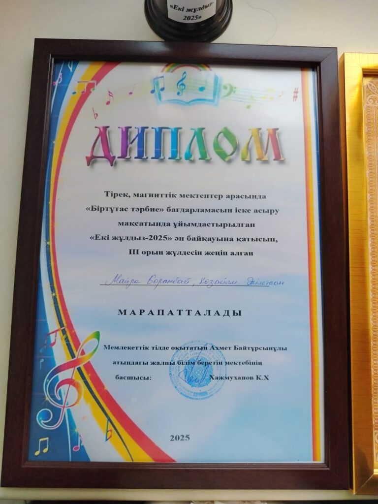 Трек магниттік мектептер арасында «Біртұтас тәрбие» бағдарламасын іске асыру мақсатында ұйымдастырылған «Екі жұлдыз—2025» ән байқауына мектебіміздің ата—анасы Боранбаева Майра қызы Көзайыммен жүлделі III орынды жеңіп алды.